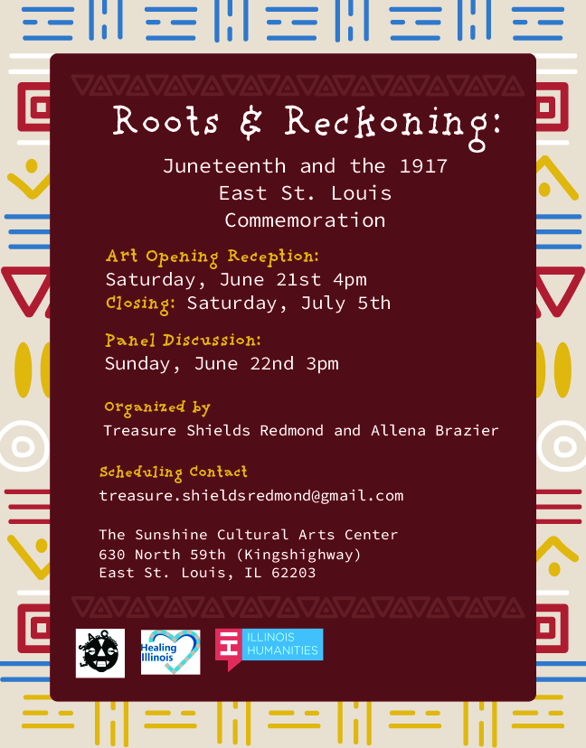 On Saturday afternoon (the 21st) there will be an art exhibit opening with wine and music. On Sunday afternoon (the 22nd) there will be a panel discussion with descendants of families who survived the 1917 East St. Louis Race Massacre.